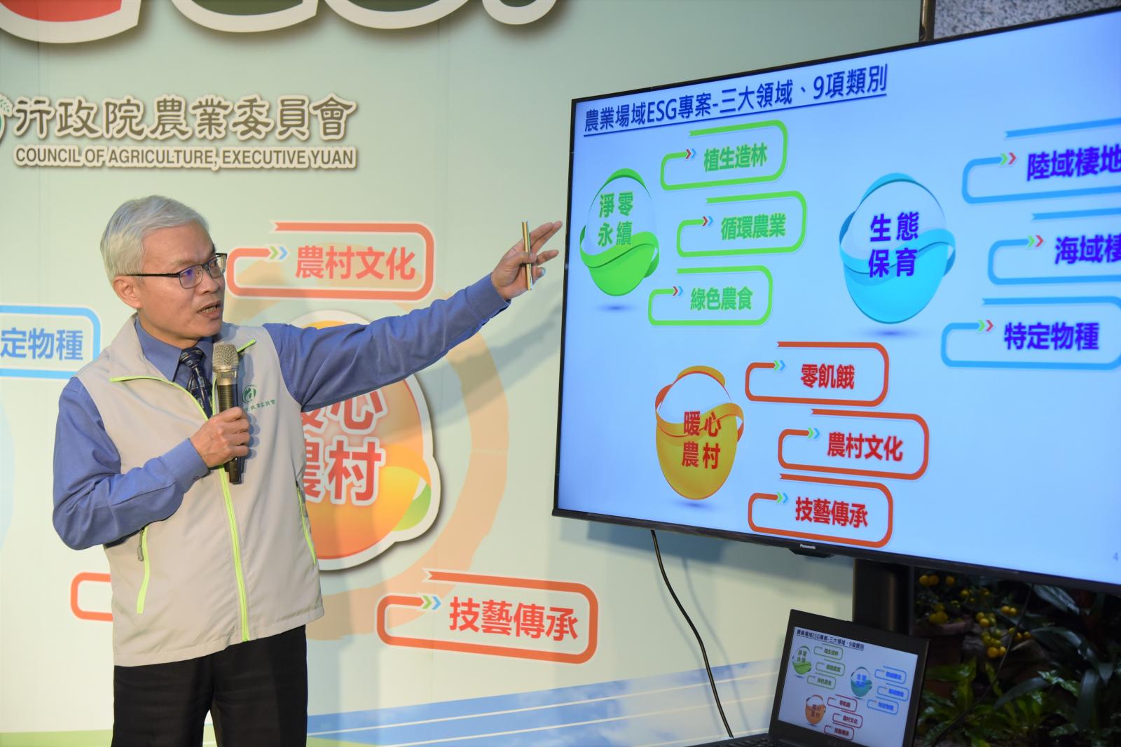 農委會於 2 月 7 日日上午召開記者會,正式對外說明農業部門在企業 ESG 揭露需求上可提供的服務。農委會表示,ESG 係指環境 (Environment)、社會責任 (Social)及公司治理 (Governance),是用於評估企業能否永續經營的重要指標,目前推出農業永續 ESG 專案可分成淨零永續、生態保育、暖心農村三大領域,共計 9 項專案類別,並結合對應永續指標 (SDGs)。期盼透過公私協力,創造合作可能性,共創雙贏互利。
