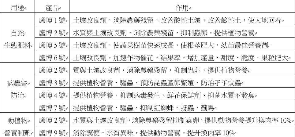 卢博士的无毒生态肥料,适用领域广泛,包括花卉园艺、中药产业、果蔬产业、粮食产业、畜牧业、渔业、茶叶产业等,希望能创造出无农药、无抗生素、无生长激素的环境。具体作法包括有: