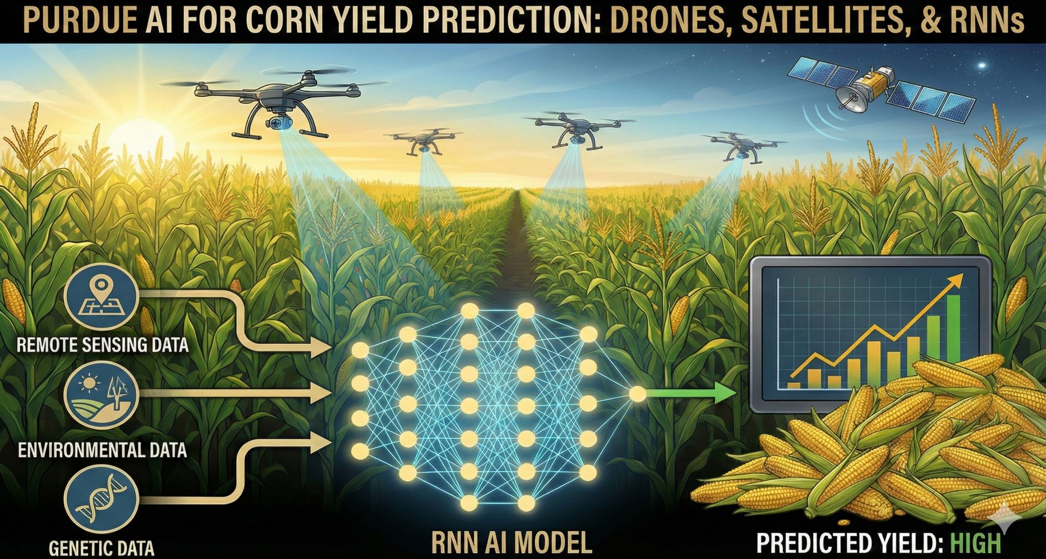 美國普渡大學的研究團隊開發的人工智慧(AI)模型,該模型能夠預測作物產量,特別是玉米的產量。研究人員利用遞歸神經網絡(RNN)來預測玉米產量,這一模型結合了遙測技術、環境數據和基因數據。該研究顯示,使用無人機和衛星進行的遙測數據收集可以顯著提高作物表型分析的效率,並減少人工勞動需求,這對於應對氣候變化及提高農業生產力具有重要意義。