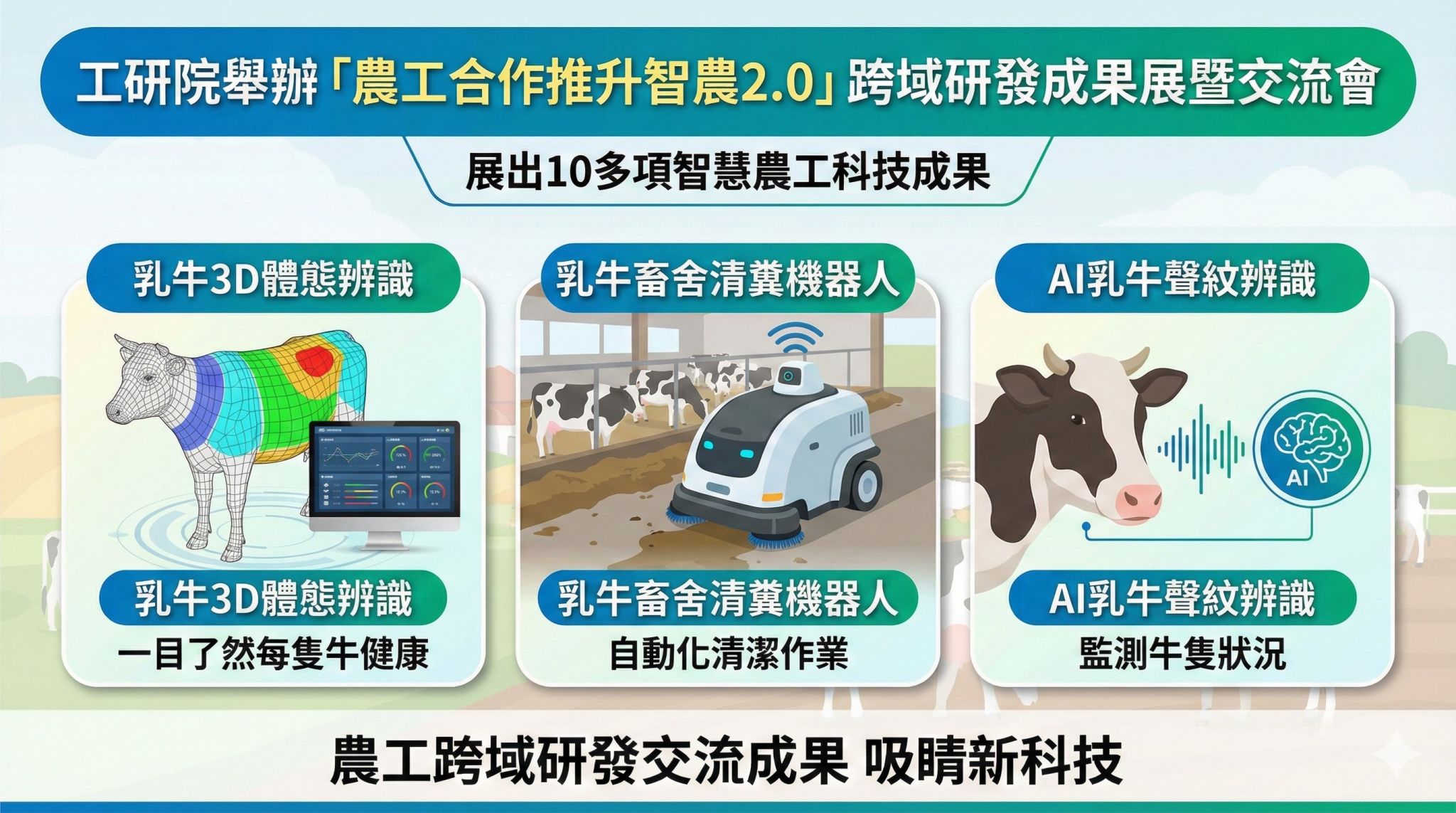 工研院舉辦「農工合作推升智農2.0」跨域研發成果展暨交流會,展出智慧農工合作10多項農工科技成果,尤其有助酪農一目了然每隻牛健康的「乳牛3D體態辨識」、「乳牛畜舍清糞機器人」與AI「乳牛聲紋辨識」等多項吸睛功能。