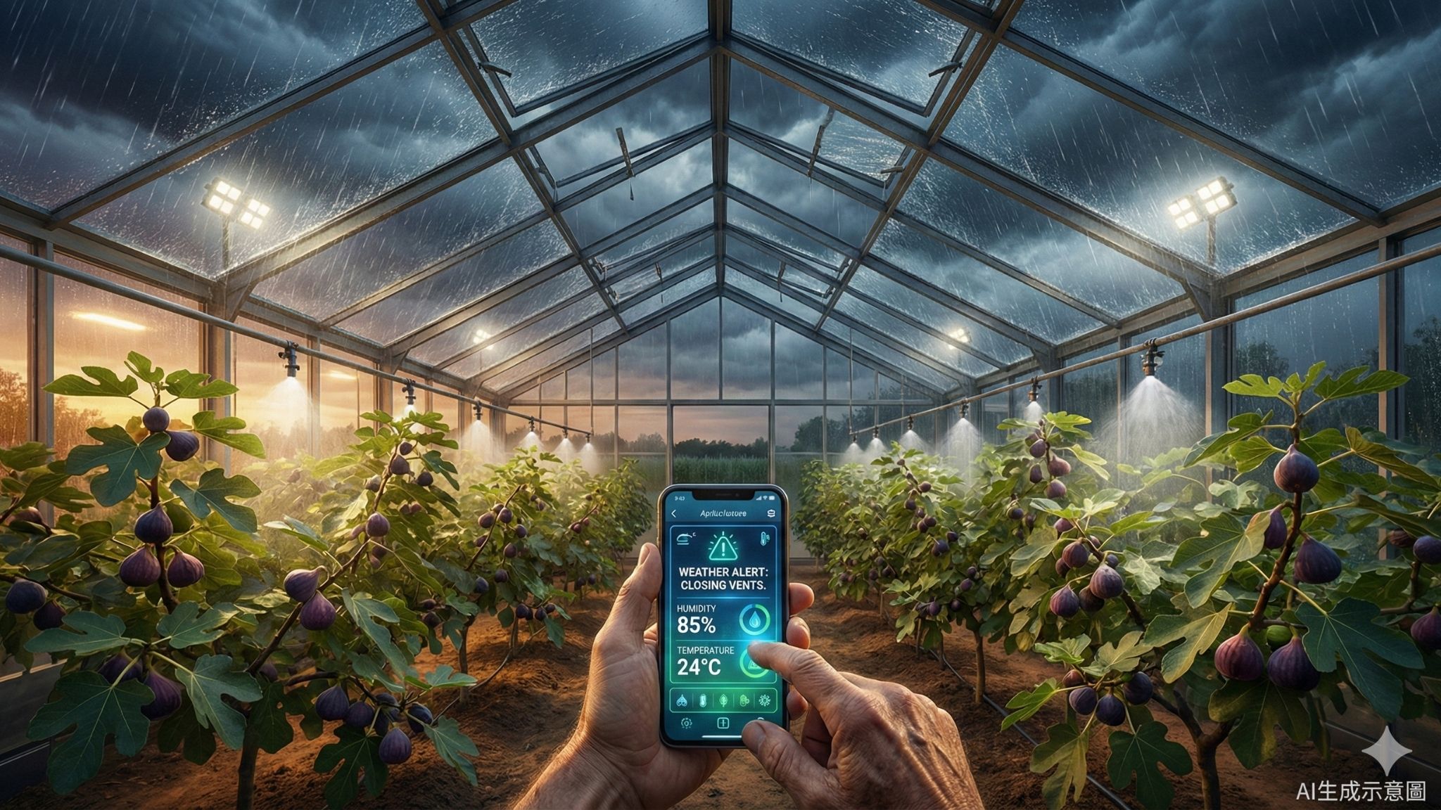 無花果是高度敏感作物,每天需要照射陽光6小時,但若遇雨即容易損失,張麗善表示,以前只要開始下雨,果農就算從家裡馬上趕到果園關天窗,都已來不及,導入智慧科技後,可依據即時天候自動調整天窗開關與噴灌作業,只要手機在手,都不必擔心。