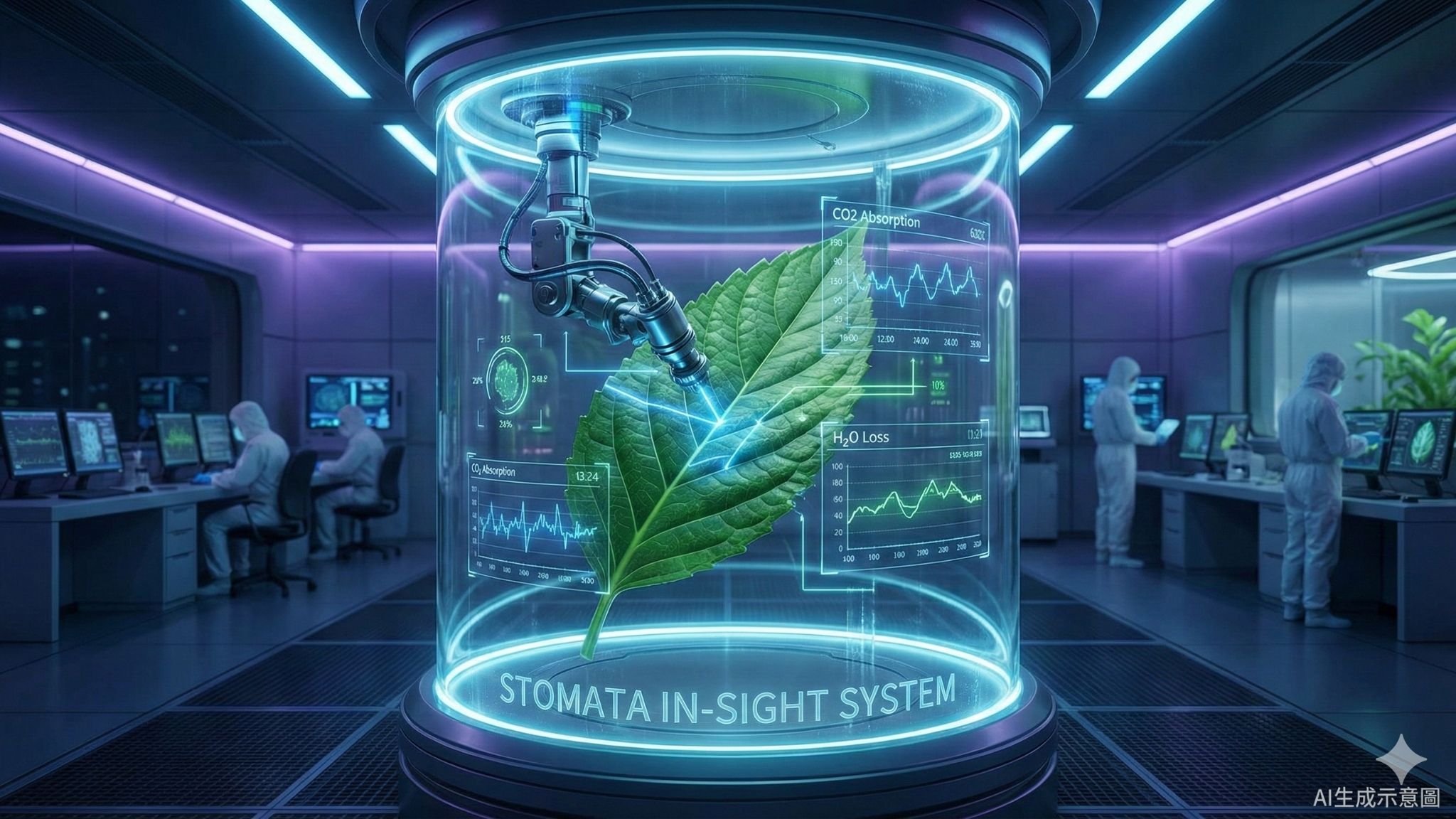 該系統整合三項關鍵技術:活體共軛焦顯微鏡可在不破壞葉片的情況下,取得氣孔高解析度的立體影像;高精度氣體交換感測器可即時量測光合作用與蒸散作用;環境控制艙則可精準調整光照、溫度、濕度與二氧化碳濃度,以模擬各種自然條件。透過技術整合,研究人員能直接觀察氣孔如何隨環境變化即時開閉。
