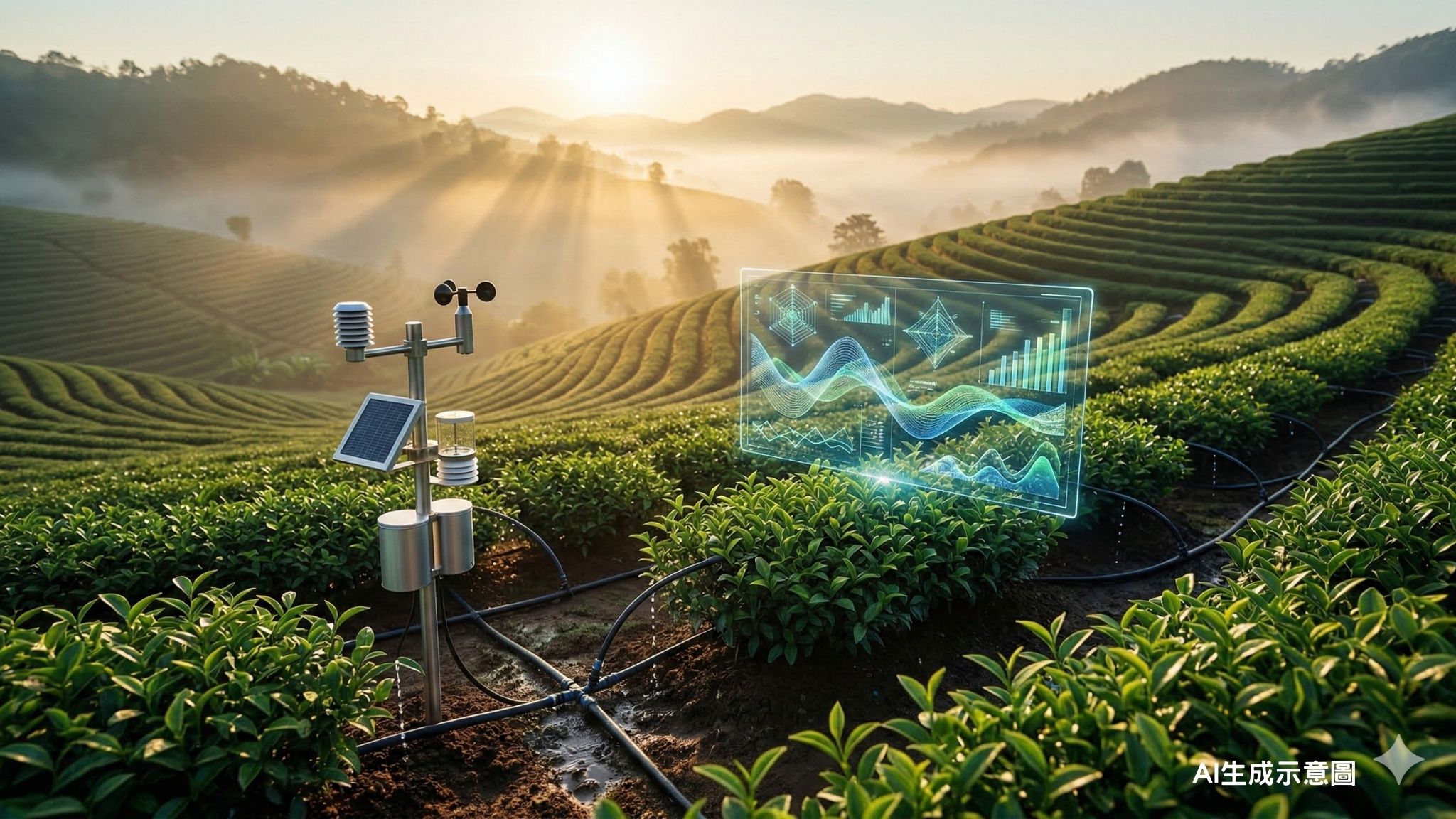 農業部茶及飲料作物改良場建構茶園精準灌溉決策模式,透過微氣象觀測站資料、蒸發散量(ET)指標與物聯網感測技術,開發「茶園精準滴灌參數模組」,並導入AI運算與雲端平台進行灌溉管理。研究顯示,精準滴灌可依降雨、土壤含水量與蒸散變化動態調控水量,在夏季與枯水期皆能提升茶芽數與茶菁產量,同時節省約13%至24%灌溉水量,並改善茶葉香氣、滋味與回甘度。